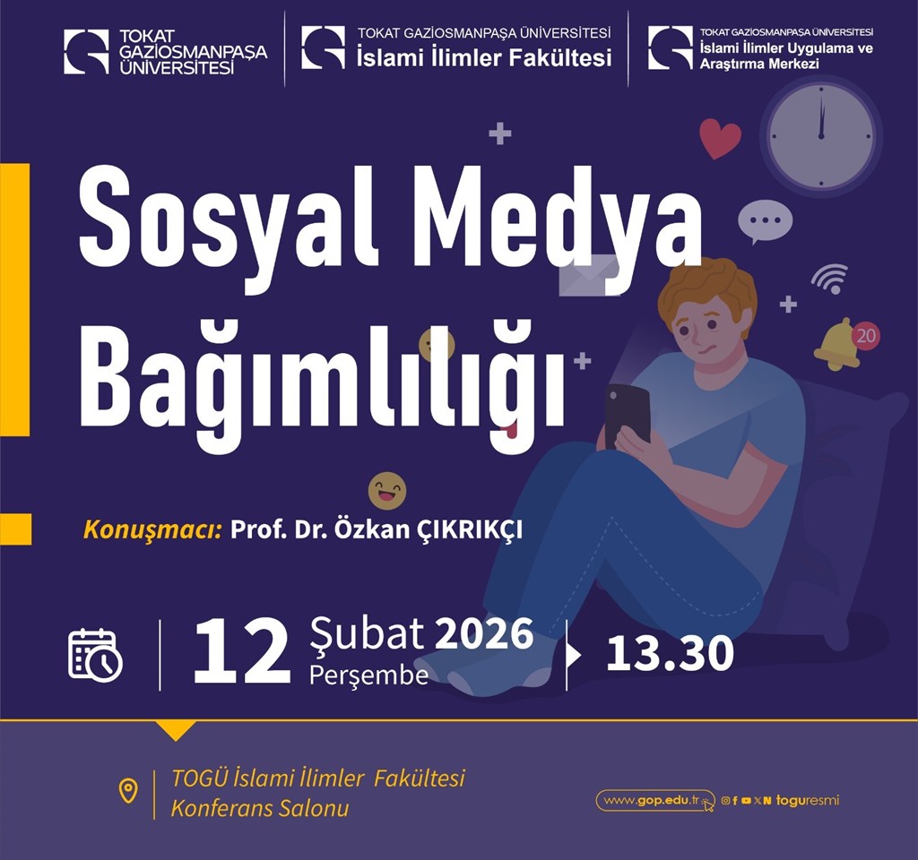 Tokat Gaziosmanpaşa Üniversitesi İslami İlimler Fakültesi olarak, bu sorulara birlikte cevap aramak amacıyla “Sosyal Medya Bağımlılığı” konulu konferansımıza sizleri davet ediyoruz.