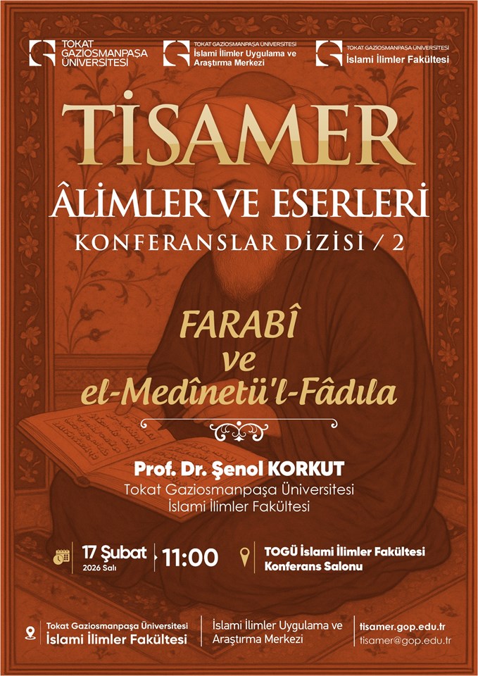 Tokat Gaziosmanpaşa Üniversitesi İslami İlimler Uygulama ve Araştırma Merkezi (TİSAMER) tarafından düzenlenen “Âlimler ve Eserleri” Konferanslar Dizisinin ikinci programında, İslam düşünce tarihinin önemli isimlerinden Fârâbî ve onun meşhur eseri el-Medînetü’l-Fâzıla ele alınacaktır.