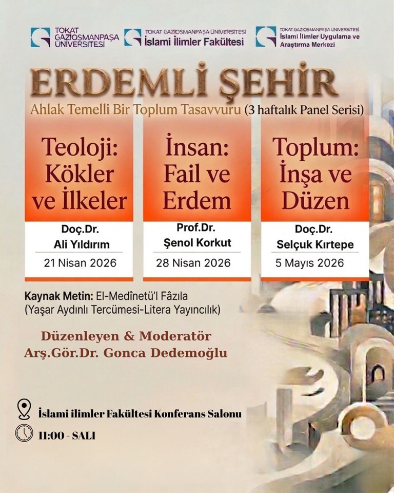 İslam düşünce geleneğinin önemli isimlerinden Farabi’nin kaleme aldığı “El-Medînetü’l-Fâzıla (Erdemli Şehir)” adlı eserin ele alınacağı bu panel serisinde, alanında uzman akademisyenlerimiz sunum gerçekleştirecektir.